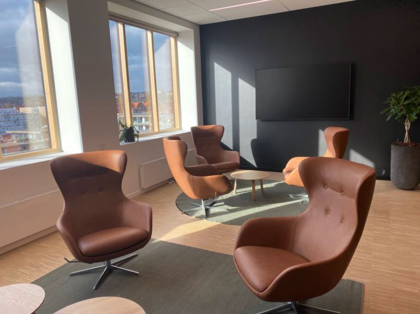 Hos BDO ønskede de eksklusiv reception og loungeområder. Søren Lund stole og sofaer var pænt integreret.